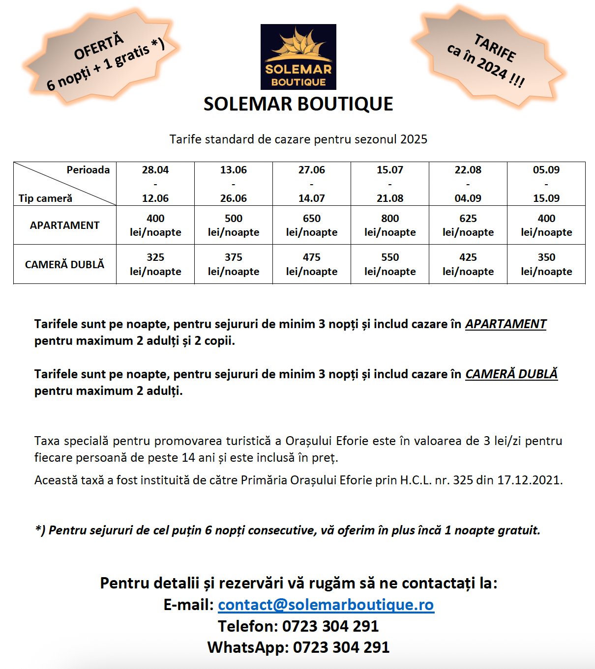 Tarifele și ofertele menționate mai sus sunt valabile doar la rezervările efectuate direct la noi, nu prin intermediul altor parteneri!